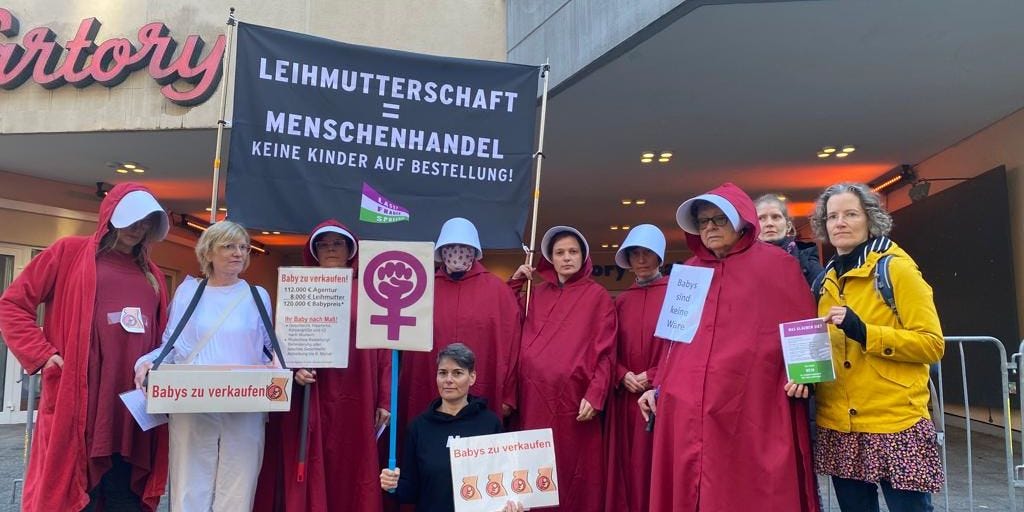 On the weekend of the 18th and 19th of October the streets of Cologne played host to a commanding sight: outside the Sartory-Säle, one of the largest event halls in the city, gathered a group of defiant women clad in the famous red costumes from The Handmaid’s Tale. Striking against their crimson cloaks were their laminated white placards, displaying their message clearly: ‘surrogacy is the exploitation of women’ (Leihmutterschaft ist Ausbeutung von Frauen.), ‘stop child trafficking!’ (Kinderhandel stoppen!), and ‘pregnancy is not a business model!’ (Schwangerschaft ist kein Geschäftsmodell!).